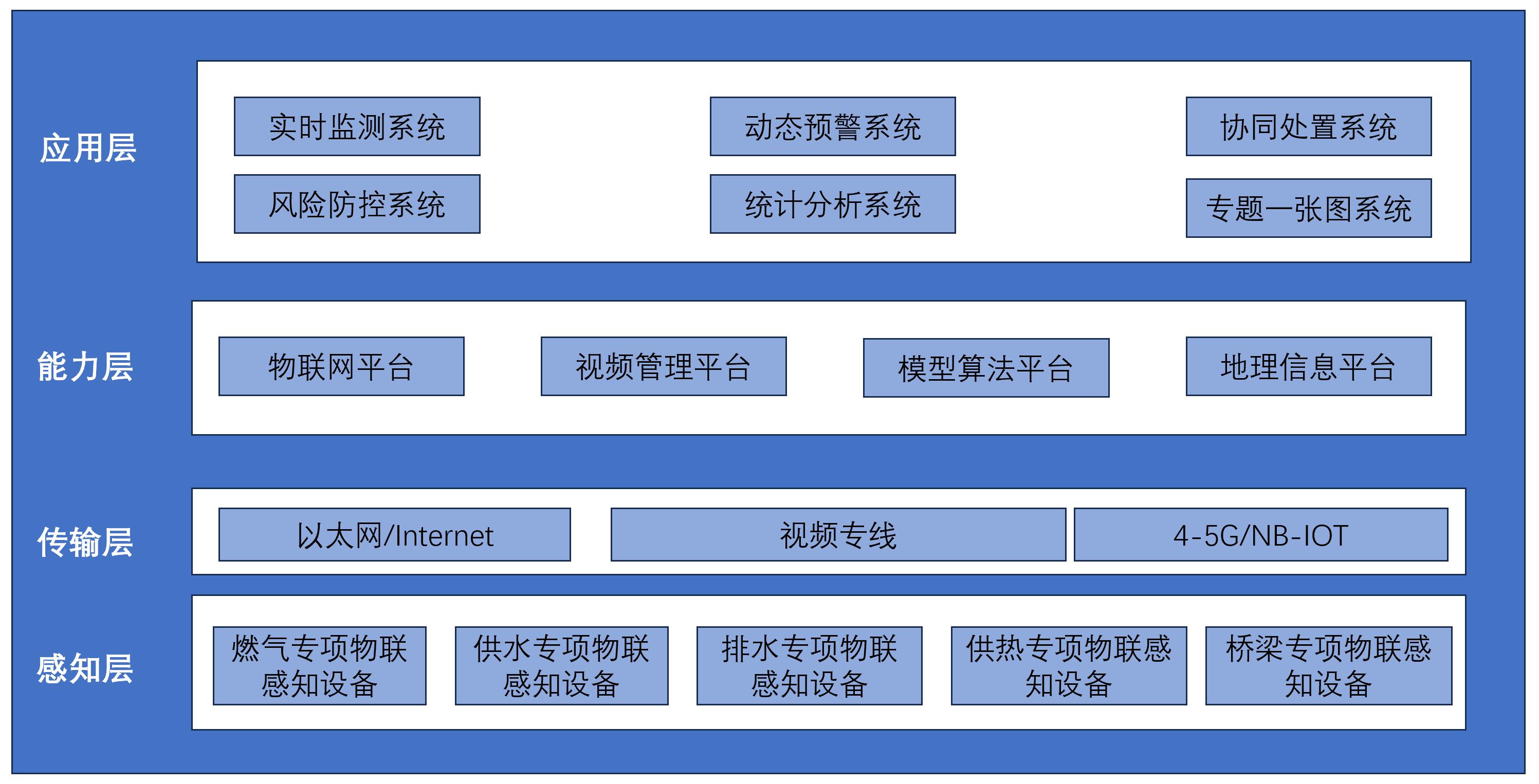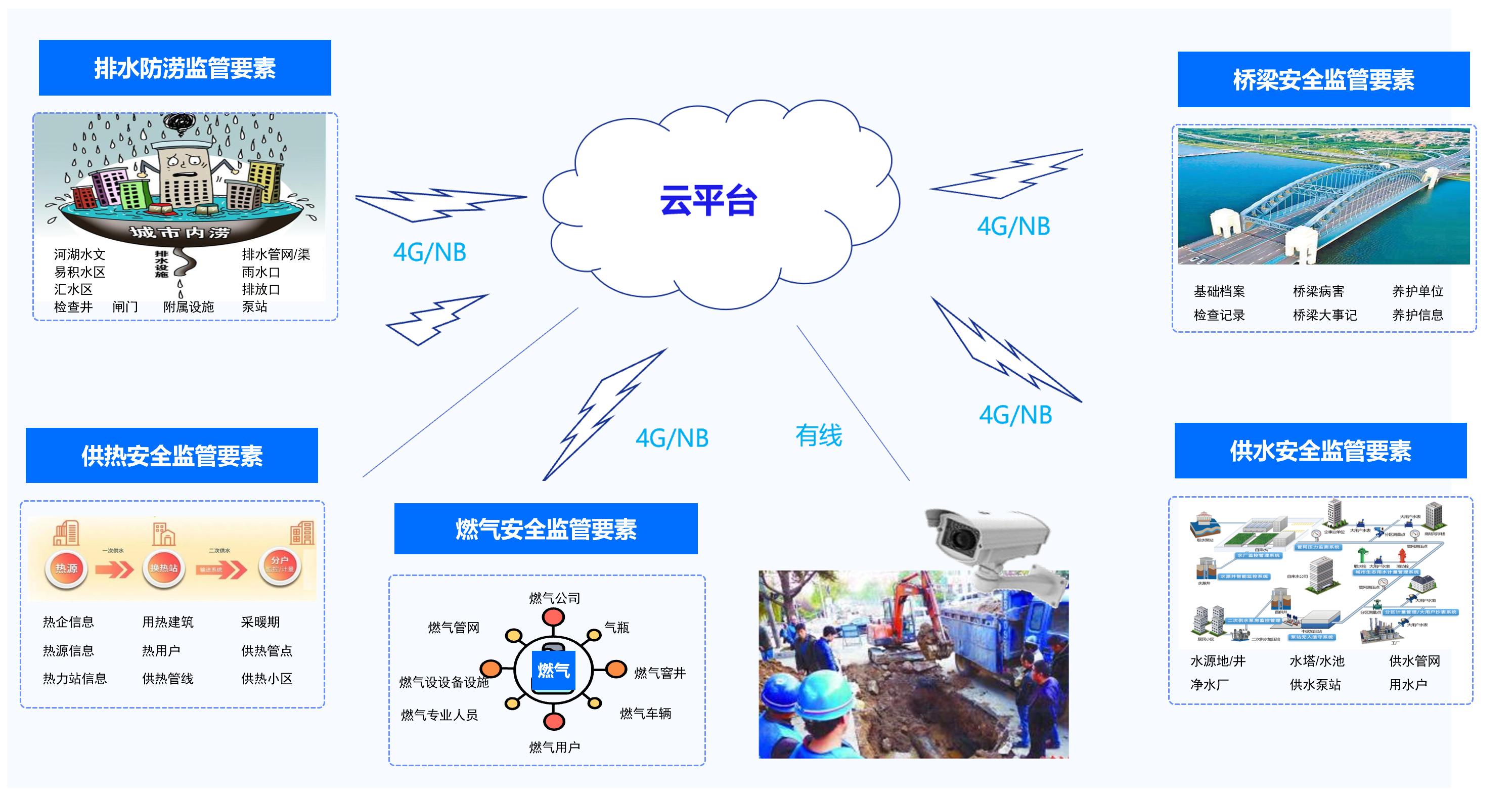 ◆  借助物联网、大数据、云计算等信息化技术手段,围绕燃气、供热、桥梁、供水、排水等方面构建城市生命线安全运行感知网,推进城市生命线运行监测的集约建设、资源共享,构建全域覆盖的城市安全运行保障体系。